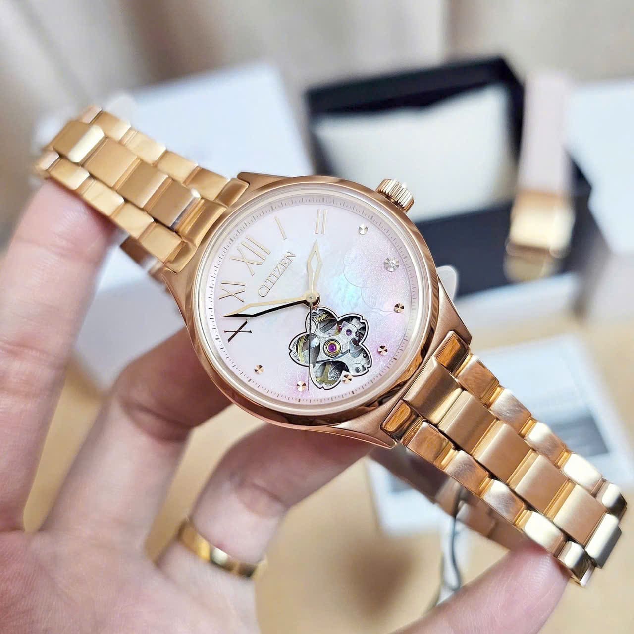 Phiên bản Lady Open Heart của dòng Citizen Mechanical Flower sử dụng bộ máy Automatic cao cấp phối hợp với thiết kế tinh tế hiện đại, giúp quý cô luôn nổi bật và thanh lịch .