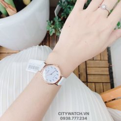 Dây da trơn bản nhỏ màu trắng thanh lịch đi kèm lối thiết kế giản dị 3 kim được mạ vàng hồng, toát lên nét đẹp dịu dàng, nữ tính, phù hợp với các quý cô sành điệu.