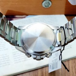vỏ và vòng đeo tay bằng thép không gỉ hai tông màu với mặt số màu xanh đồng hồ bấm giờ, lịch vạn niên, thời gian 12/24 giờ, báo thức, dự trữ năng lượng, tachymeter, ngày và ngày