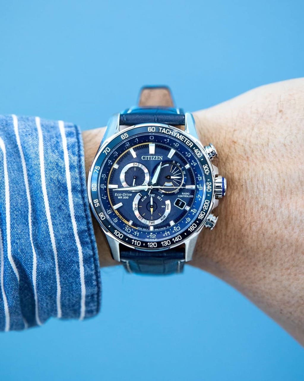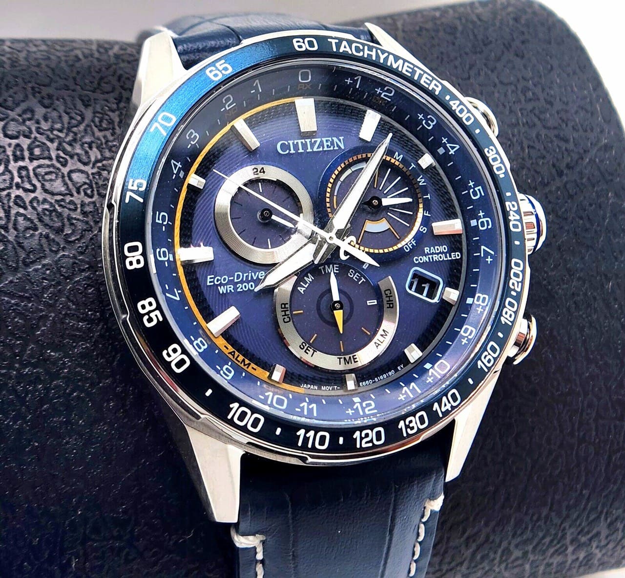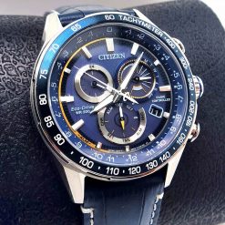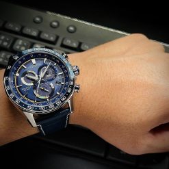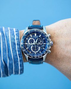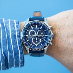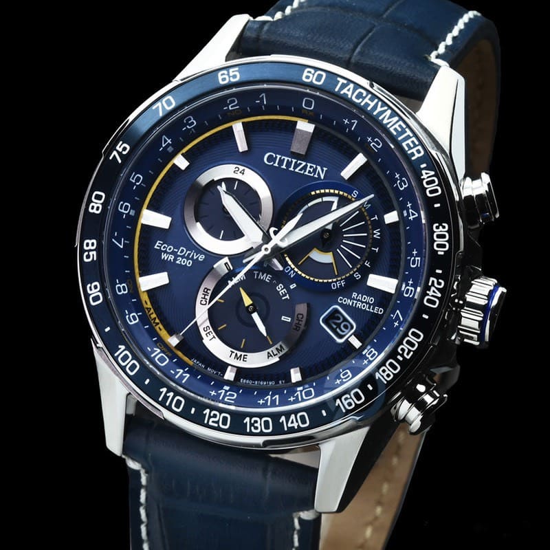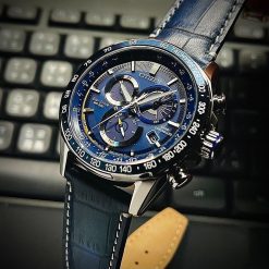 Vỏ và vòng đeo tay bằng thép không gỉ với mặt số màu xanh blue, đồng hồ bấm giờ, lịch vạn niên, thời gian 12/24 giờ, báo thức, dự trữ năng lượng, tachymeter, ngày và ngày.