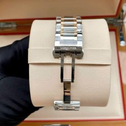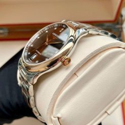 Điều khiến cho mẫu đồng hồ này càng thêm đẳng cấp đó là các chi tiết vàng đều là vàng nguyên khối 18K, cọc số được gắn 12 viên kim cương sang trọng!
