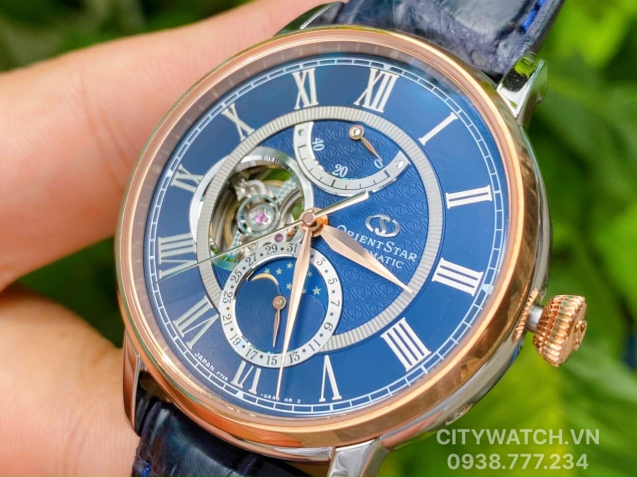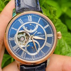 Cuốn hút sang trọng với dial xanh, niềng và núm được mạ vàng hồng PVD sạng trọng, hở tim góc 9h quyến rũ và đặc biệt là lịch tuần trăng Moonphase cao cấp.